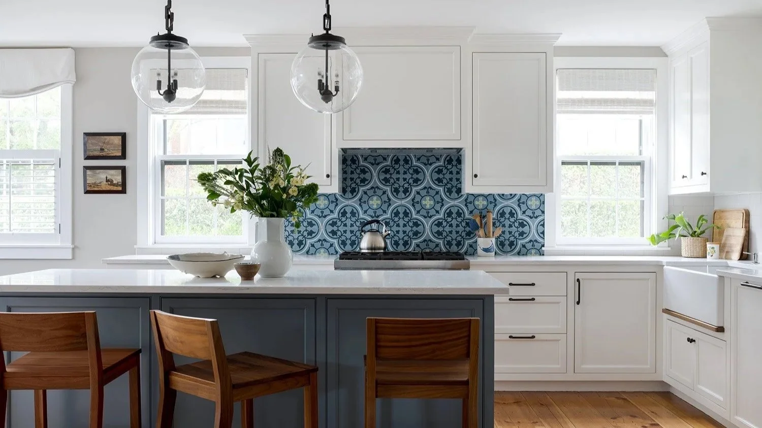 After spending summers on Nantucket with relatives at an estate, a couple bought this cottage nearby to start their own family traditions. The pair had previously worked with Pinney Designs on the interiors of their Boston-based primary residence. They were delighted with the results, so they contacted her again to address the cottage's interior design and architecture. Emily used the clients’ own wooden antiques and artwork where possible and designed and sourced new upholstery for a cohesive aesthetic. A bunk room was added to accommodate a growing family and renovation of the bathrooms and kitchen, with a modernized layout, provided better storage and workflow.